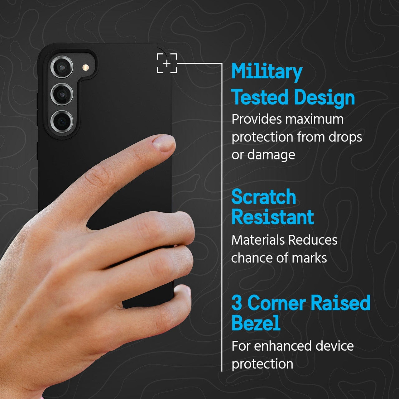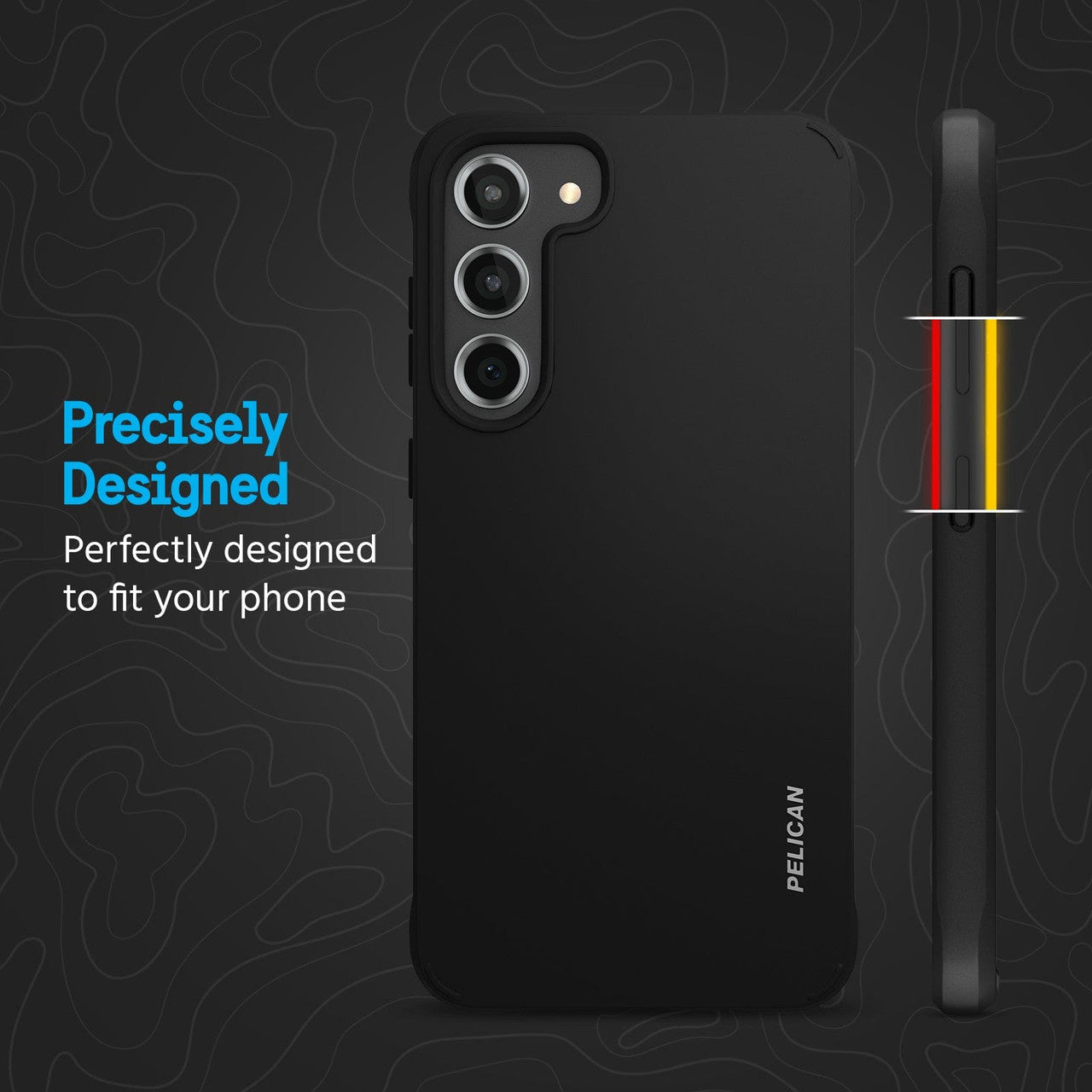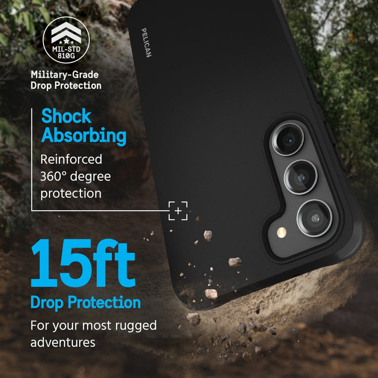 Pelican Ranger Case Samsung Galaxy S23+ Plus - Black is sleek yet rugged and built to military-grade specifications to withstand any test. Reinforced sides and cushioned corners disburse impact for drops up to 15 feet. Protect your device with the brand trusted by professionals for 40 years.