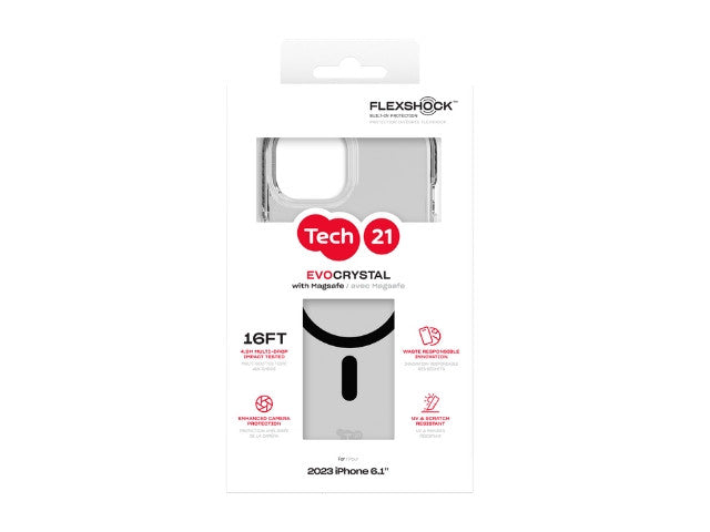 Protect your iPhone 15 Pro with a Tech21 Evo Crystal MagSafe Case iPhone 15 Pro - Graphite Black, the toughest transparent case on the market, made with our exclusive FlexShock™ impact material for incomparable 16ft multi-drop protection and anti-yellowing technology for crystal clear clarity. For the person who wants to give their device premium MagSafe®-friendly protection while admiring Apple’s original design aesthetics.